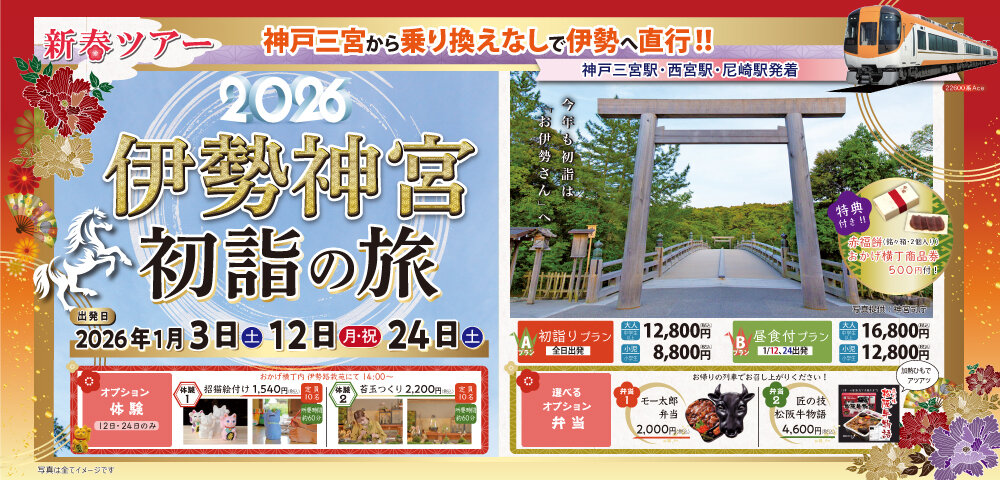 - ☆新春ツアー☆ 神戸三宮から乗り換えなしで伊勢へ直行!!『伊勢神宮初詣の旅2026』