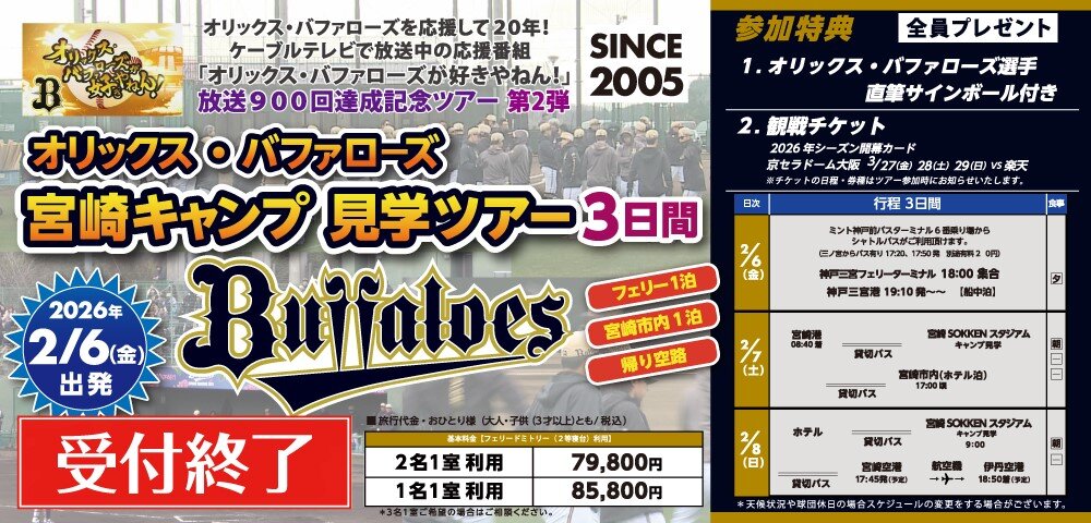 オリックス・バファローズ 宮崎キャンプ見学ツアー2日間 - オリックス・バファローズ宮崎キャンプ見学ツアー2日間 ~ 宮崎空港集合プラン(ホテル1泊朝食付)~ 2026年宮崎キャンプ見学ツアー第1弾は、宮崎空港集合プランのため、全国各地からご参加いただけます! ■参加者全員プレゼント■ 1.オリジナルグッズ 「オリックス・バファローズが好きやねん!」 番組ロゴ入りフェイスタオルをプレゼント! 番組初のオリジナルグッズです♬ 2. オリックス・バファローズ選手との記念撮影!! (全員集合写真となります) ※練習スケジュール等の都合で急きょ実施できない場合は、別途特典をご用意いたします。 ■抽選でプレゼント■ 3.【抽選で5名様】選手直筆サインボールプレゼント♬ 4.【抽選でペア5組様】 観戦チケットプレゼント♪ 2026年シーズン開幕カード 京セラドーム大阪 ※チケットの日程・券種はツアー参加時にお知らせします。