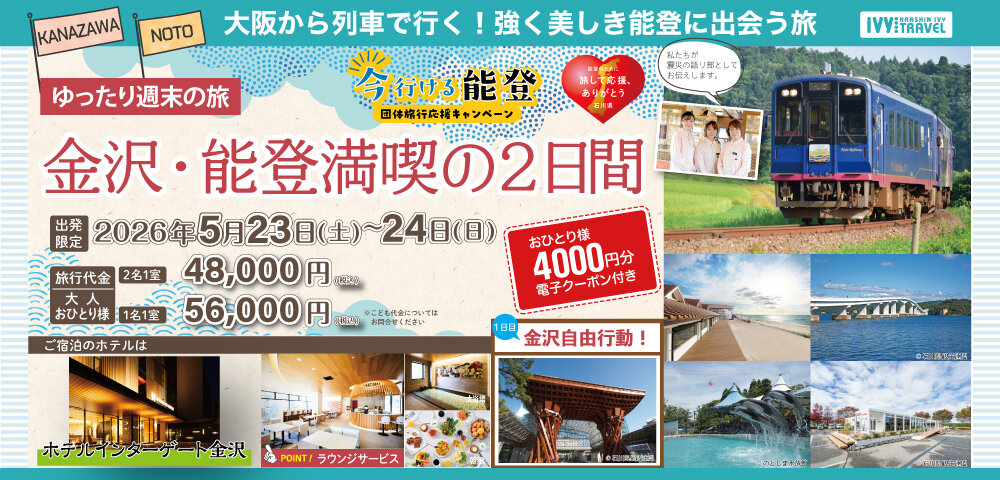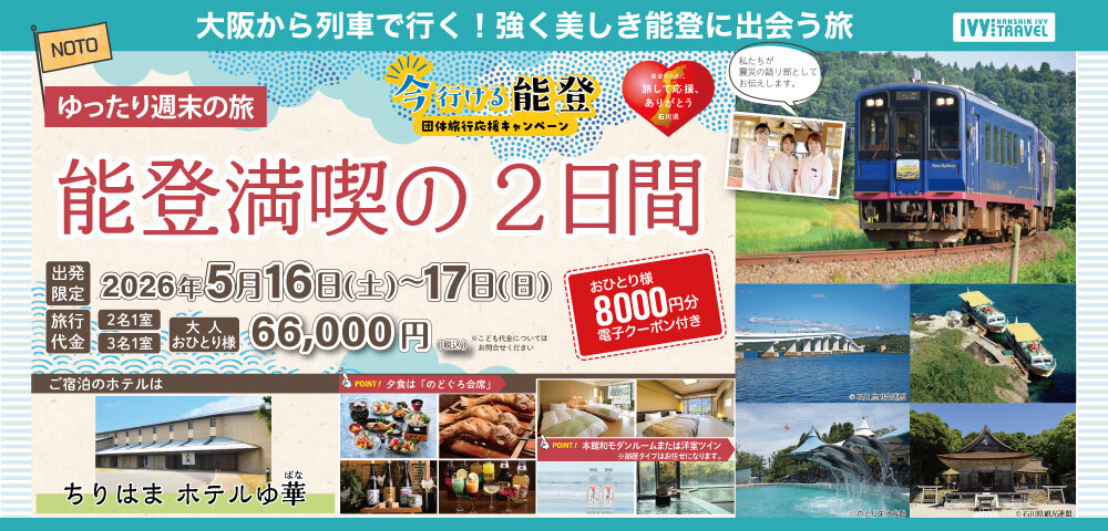 - 能登復興を応援するツアー。大阪からは列車でらくらく移動。金沢からは貸切バスで能登の魅力を満喫する2日間。能登で使える8,000円分のお買い物電子クーポン付き!!